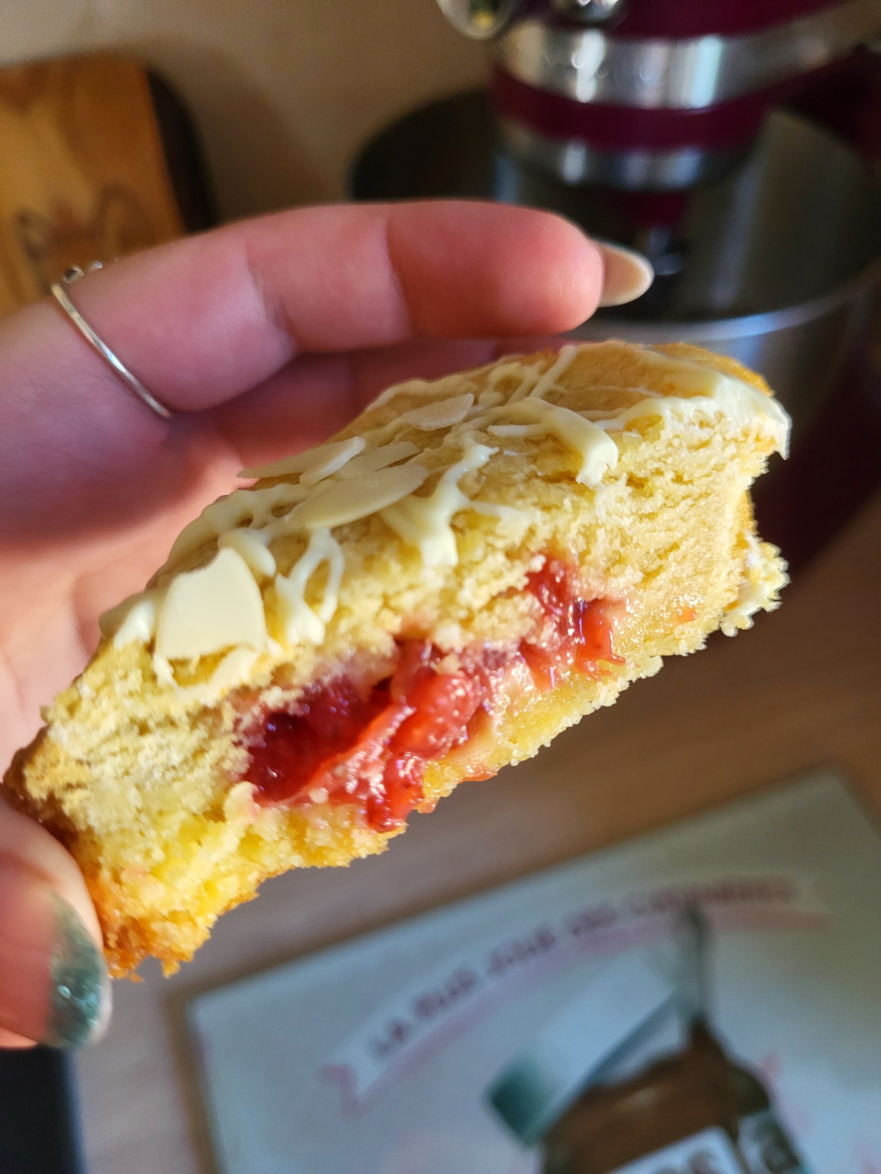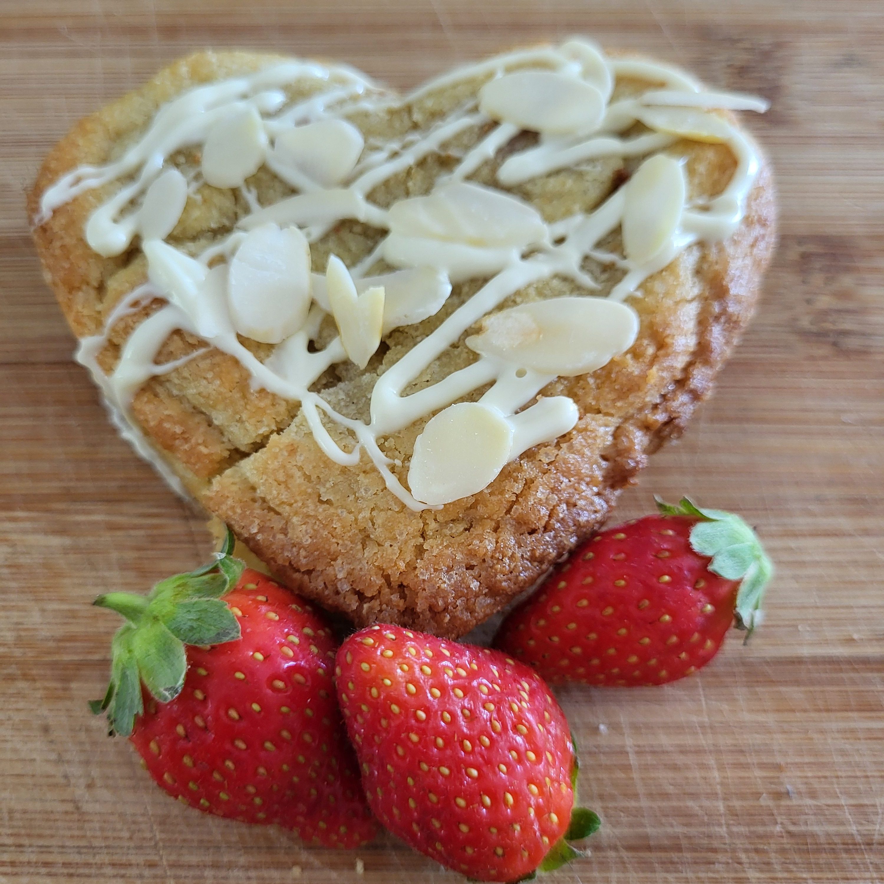 Un cookie moelleux inspiré de la célèbre tarte amandine, avec une base fondante aux amandes et un cœur de coulis de fraise maison. Le tout est nappé d’un filet de chocolat blanc fondant et saupoudré d’amandes effilées légèrement dorées. Une douceur fruitée et élégante, à mi-chemin entre cookie et pâtisserie fine.