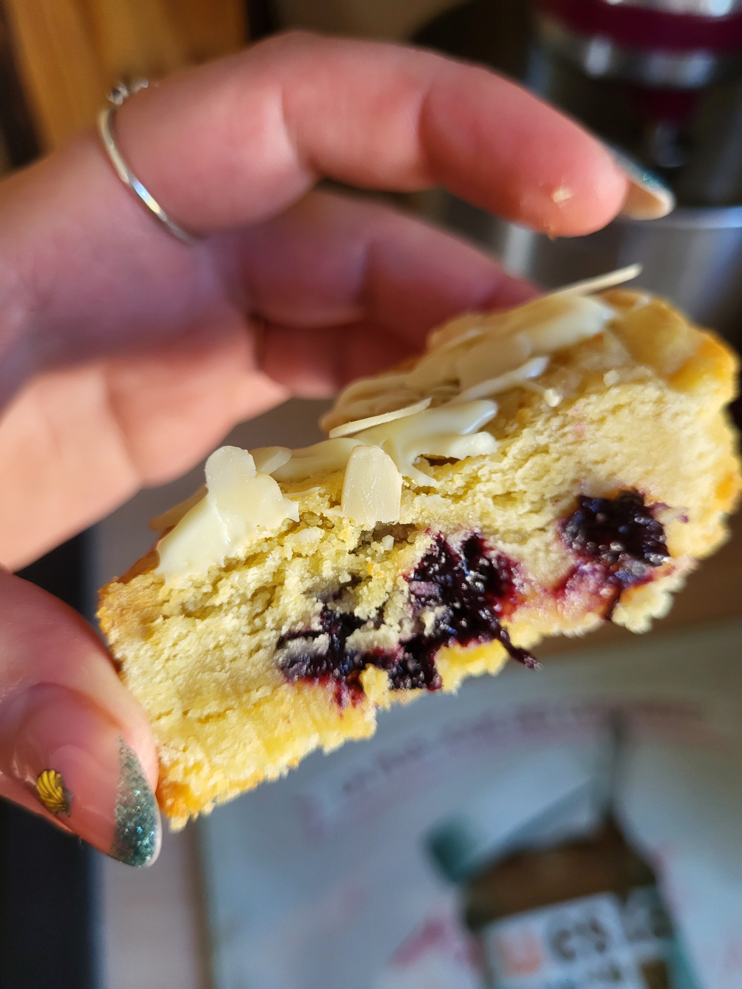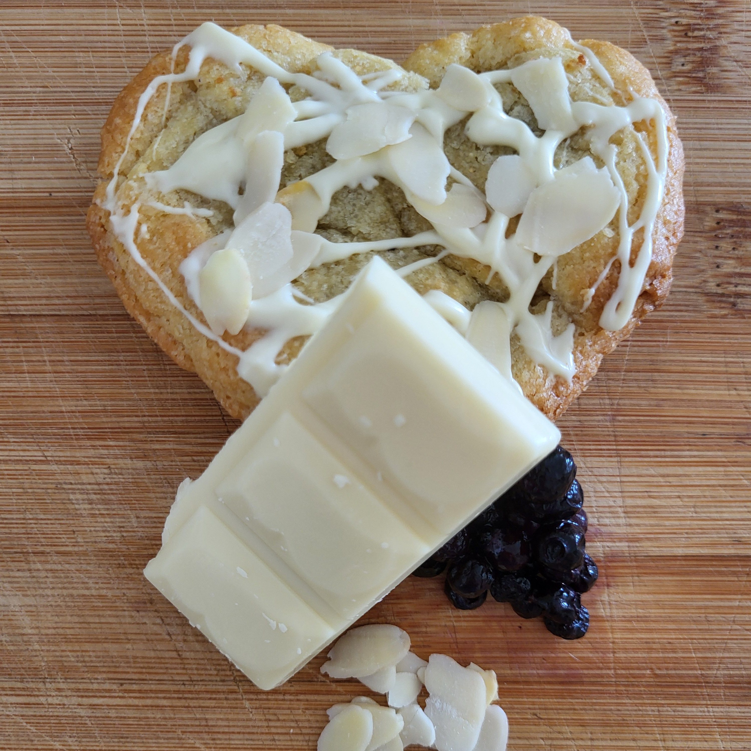 Ingrédient : Farine de blé, Œuf, Beurre, Sucre roux et blanc, chocolat blanc, myrtille, amandes.